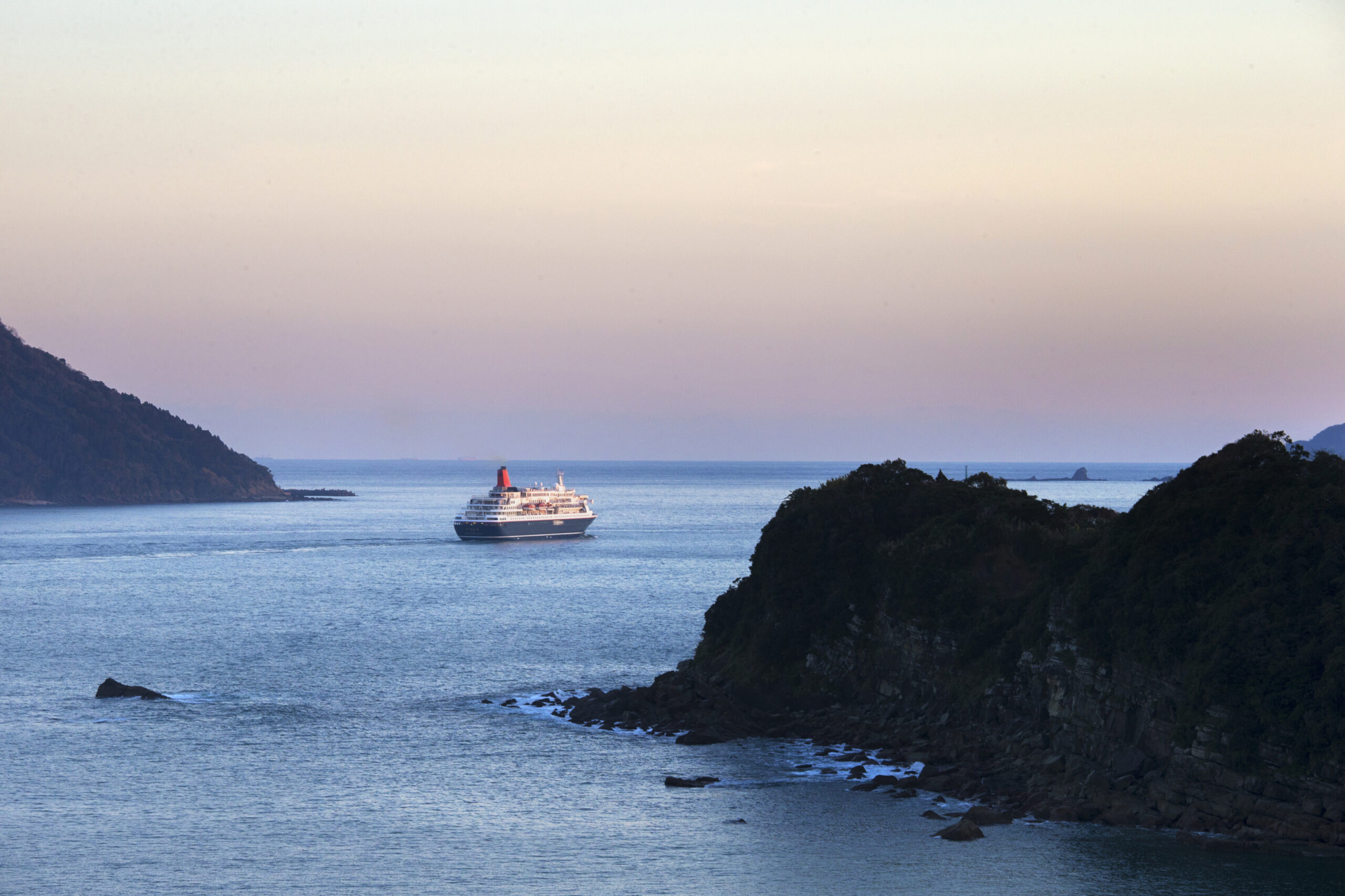 油津港へのアプローチは、険しい断崖が続く日南海岸の中で、ぽっかりと開いた穏やかな天然の良港へと進む、安堵感に満ちた時間から始まります。港の守り神である赤い灯台と、背後に広がる深い緑の山々がコントラストを描き、古くから交易を支えてきた港町の誇りを感じることでしょう。着岸時には、日南名物・泰平踊の優雅な演舞や、地元の園児たちによる元気いっぱいの旗振りが、旅人を家族のような温かさで包み込みます。