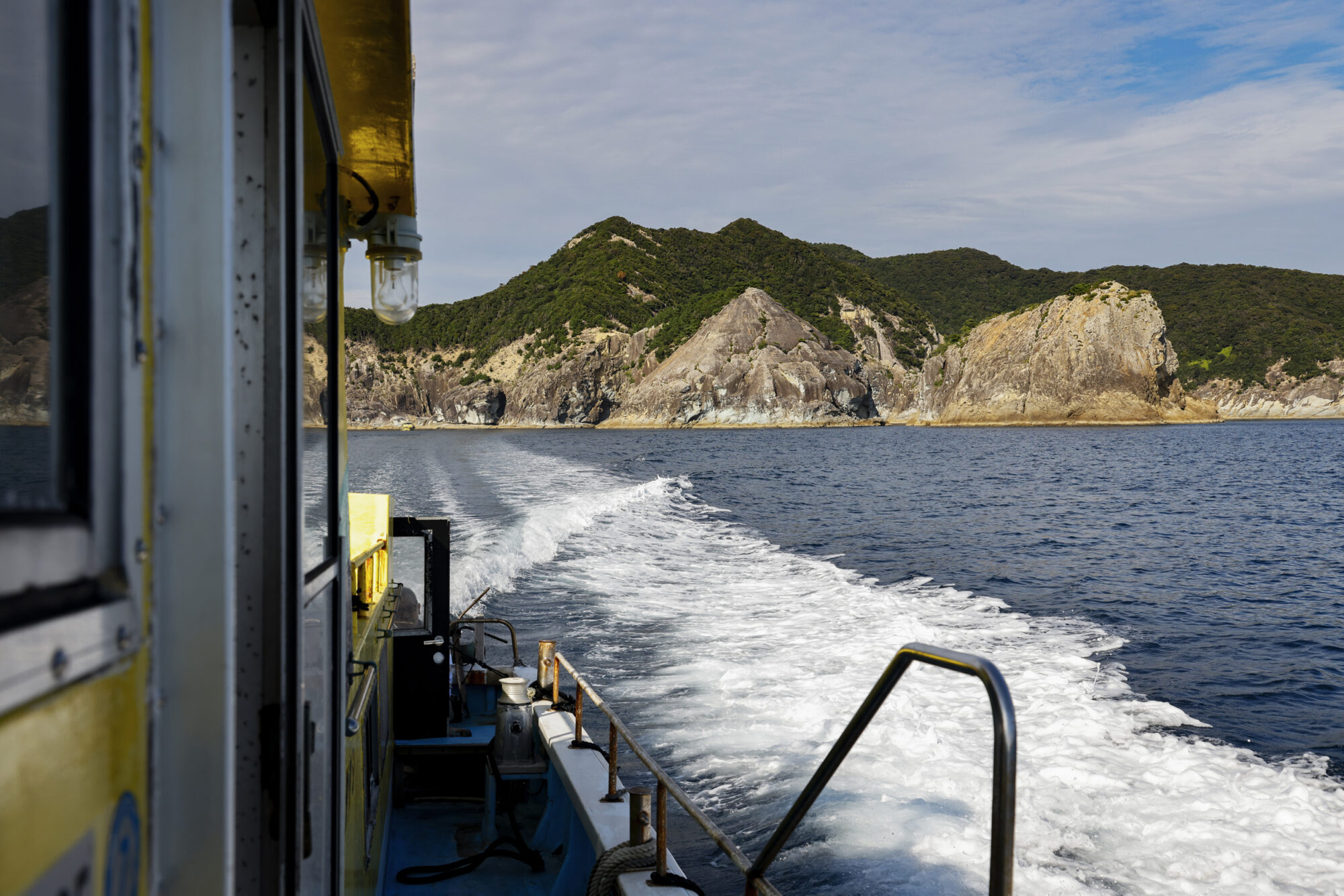 福江港へのアプローチは、点在する小島を縫うように進み、突如として三方を海に囲まれた石田城(福江城)の石垣が姿を現す、歴史の重厚感あふれる時間から始まります。船のデッキからは、シンボルである鬼岳のなだらかな曲線と、活気ある港町の風景が一度に視界に入り、五島列島の中心地にふさわしい風格を感じさせます。着岸時には、地元の方々による伝統芸能「チャンココ」の力強い舞や、五島椿をあしらった華やかな歓迎が、旅人を温かく迎え入れます。