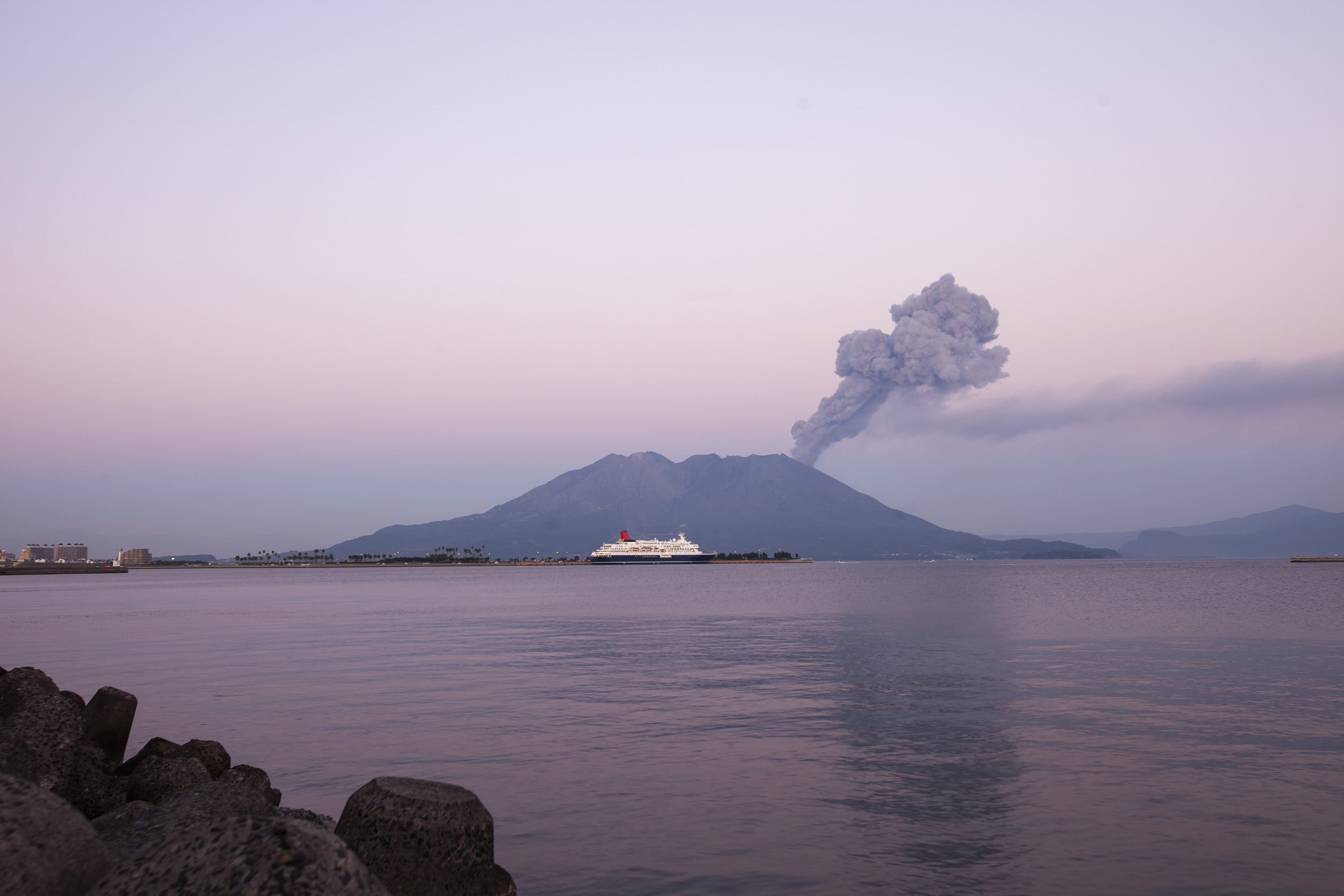 見てください、あの桜島!船乗りとして世界を回っていますが、これほど街と火山が近い港は他にありません。上陸したら、まずはフェリーで桜島に渡って、溶岩道路を走り抜けてきますよ。地球のエネルギーを間近で観察できる絶好のチャンスですからね!