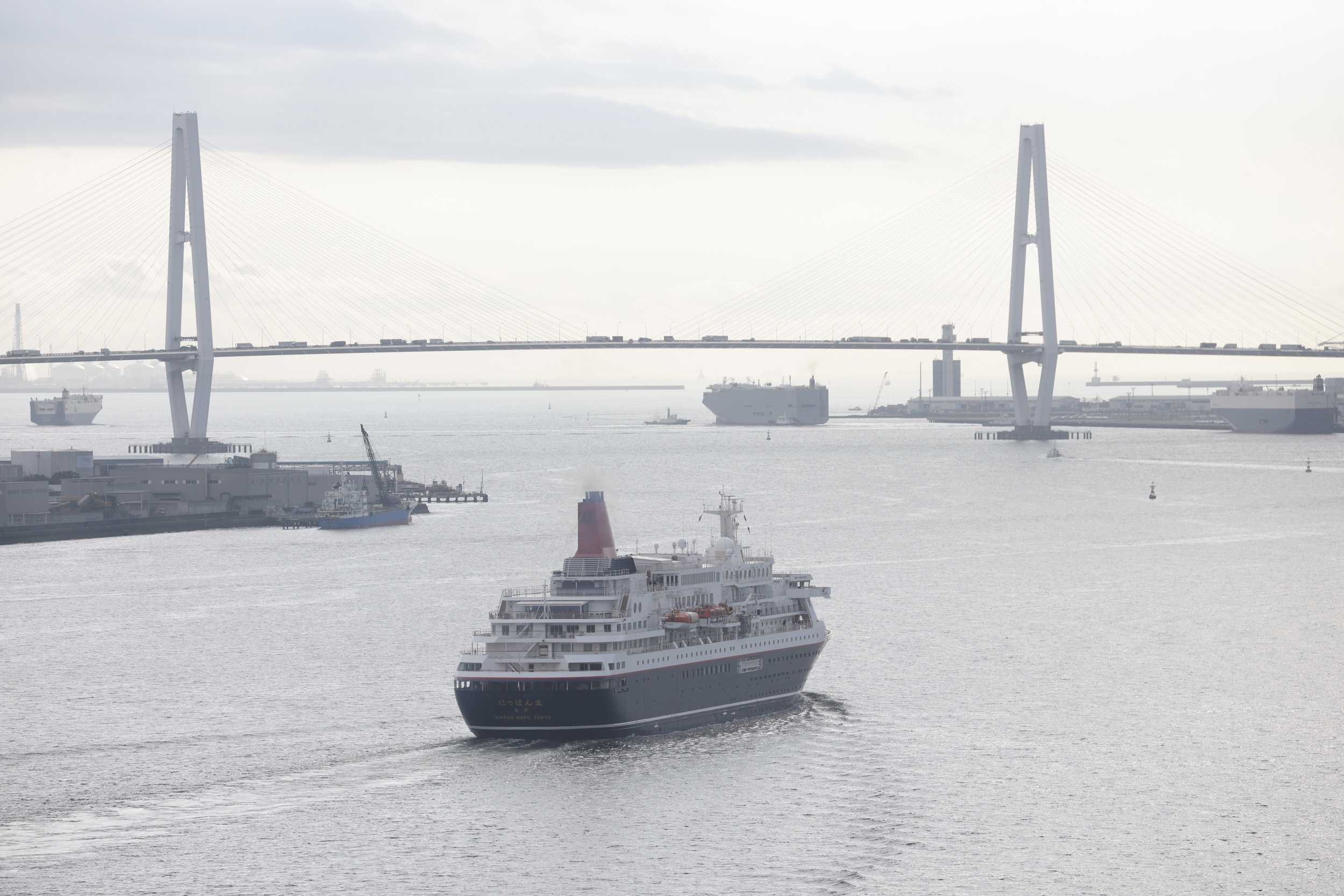 名古屋港への入港は、土木技術の粋を集めた「名港トリトン(名港東・中央・西大橋)」をくぐるダイナミックなシーンから始まります。特に中央大橋は青色に輝き、大型客船がその巨大なアーチの下をギリギリで通過する様子は、デッキにいる乗客から歓声が上がる名物イベントです。着岸するガーデンふ頭は、名古屋のシンボル・名古屋港ポートビルや、オレンジ色の船体がまぶしい南極観測船ふじが立ち並び、入港した瞬間から華やかな観光気分を味わえます。