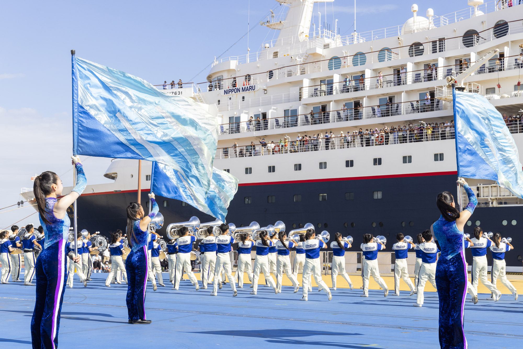 あ!『BLUE-HAWKS』ですね。青いユニフォームが港に映えて、本当に格好いいです!船の上から見ていると、地元の皆さんが一丸となって歓迎してくれているのが伝わってきて、ちょっと感動しちゃいますよね。