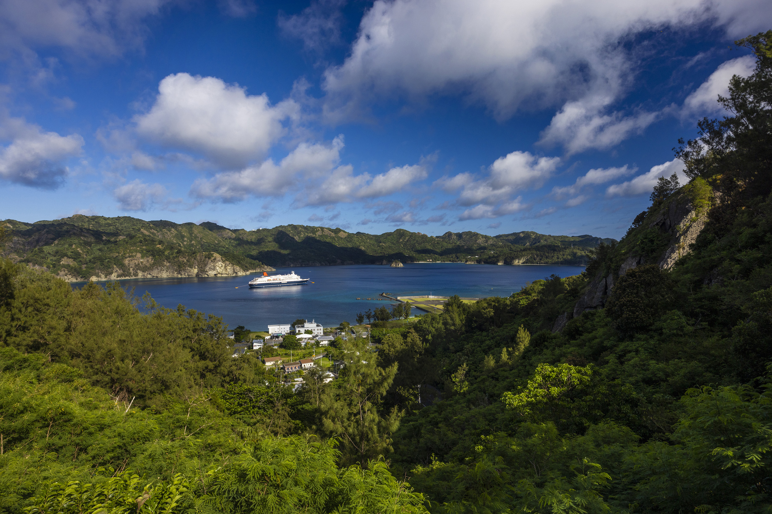小笠原・父島へのアプローチは、日本で最もドラマチックです。数日間の航海を経て、ようやく見えてくる断崖絶壁の島々。二見湾の静かな水面に浮かぶ本船から、小型のテンダーボートに乗り換えて島を目指します。海風を全身に浴びながら、透き通った青い海を渡る時間は、まさに冒険そのもの。運が良ければ、ボートのすぐ脇を野生のミナミハンドウイルカが並走してくれることもあり、上陸前から小笠原の洗礼を受けることになります。
