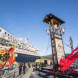 富山港への入港は、海上に浮かぶようにそびえる立山連峰のパノラマに圧倒される、日本屈指の絶景体験です。船上からは、真っ白な斜張橋・新湊大橋が青い空に映え、その下を滑るように進む高揚感を味わえます。着岸する伏木万葉ふ頭は非常に整備されており、超大型客船が接岸しても余裕のあるスペースを確保。入港時には、地元の伝統芸能・越中万葉太鼓の地を這うような力強い音色が響き渡り、富山の雄大な自然と伝統の息吹が乗客を熱烈に迎えてくれます。
