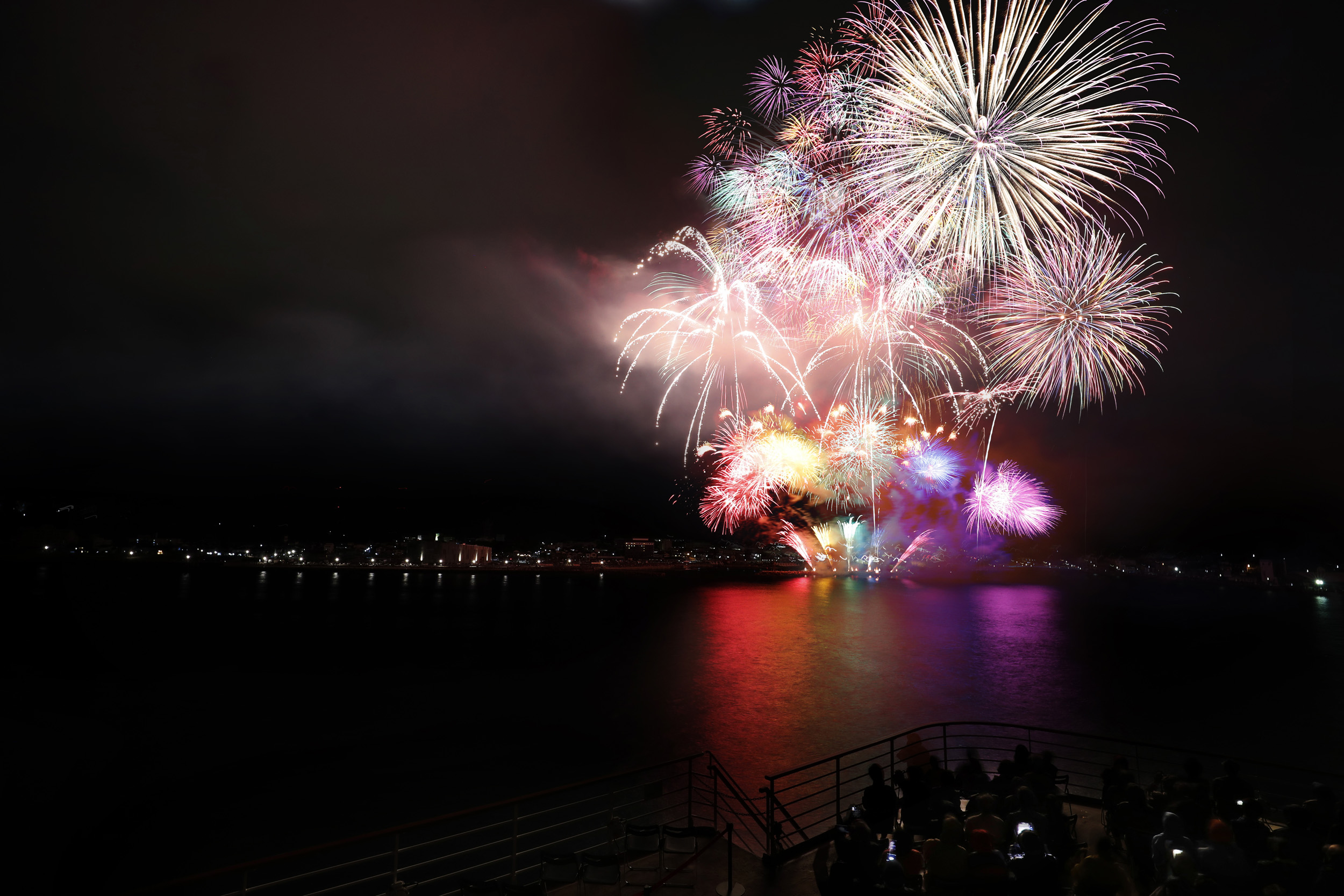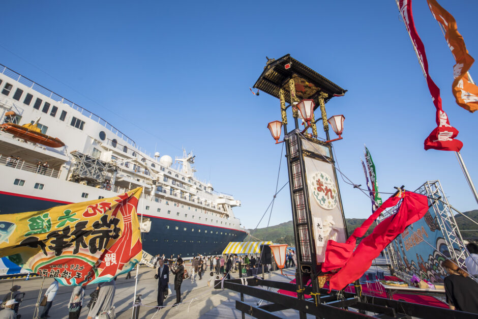 輪島港への入港は、日本海の荒波が削り出したダイナミックな海岸線を眺めながら、静かな入り江へと滑り込む感動的な体験です。船上からは、赤瓦の屋根が並ぶ街並みと、背後に控える深い緑の山々が一望できます。着岸するマリンタウンの岸壁は観光エリアに直結しており、船が近づくにつれ、地元の方々による力強い太鼓の音色や、色鮮やかな大漁旗がゲストを熱烈に迎えてくれます。能登の伝統と力強さを肌で感じる、忘れがたい上陸の瞬間です。
