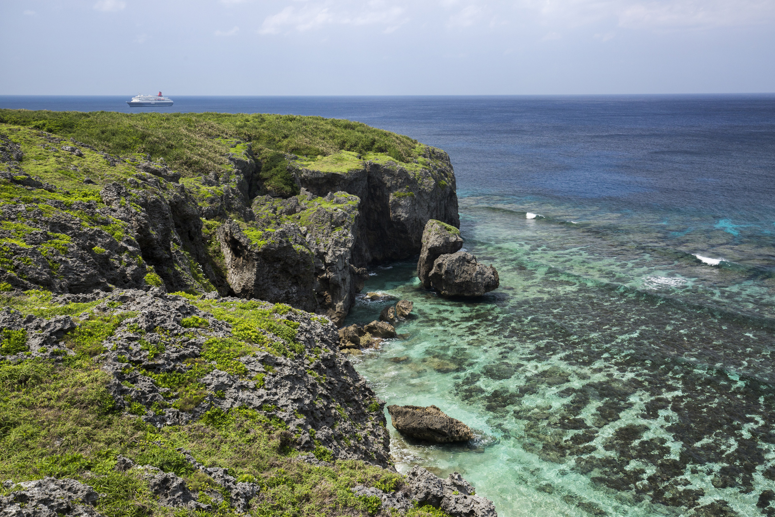 船が島の西側に近づくと、エメラルドグリーンの穏やかな海ではなく、深い紺碧の黒潮が岸壁にぶつかり白く泡立つ、荒々しい光景が迎えてくれます。アプローチの眼目は、久部良港の背後にそびえる巨大な岩塊・久部良バリや、日本で最後に陽が沈む西崎(いりざき)の灯台が、荒波の中に毅然と立つ姿。テンダーボートが揺れを越えて港内へと進むと、そこには国境の島ならではの緊張感と、どこか懐かしい漁師町の活気が混ざり合った、静かな熱気が漂っています。